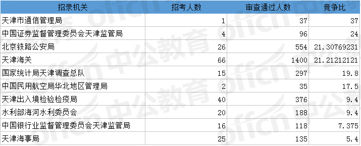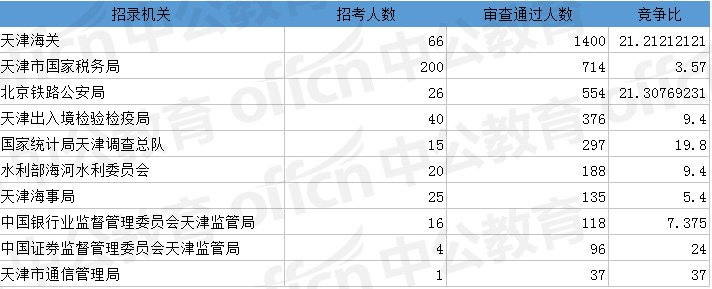 為幫助廣大考生更清晰的了解今日報(bào)名情況,中公網(wǎng)校整理了審核通過人數(shù)前十位的部門以及競爭比例最激烈的十大部門,供廣大考生參考:
