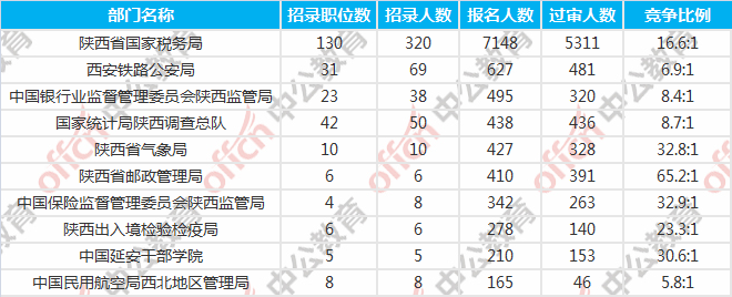 截至到3日9時,通過審核人數前三位的部門依次是:陜西省國家稅務局、西安鐵路公安局、中國銀行業監督管理委員會陜西監管局,三部門通過審核總人數達6112人,占通過審核總人數的75.1%。