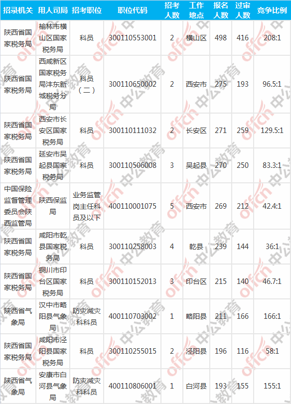 截至到3日9時,競爭比例的職位為陜西省榆林市橫山區國家稅務局科員一職,招錄2人,截至到3日9時報名人數為498人,通過審核人數為416人,競爭比例208:1!