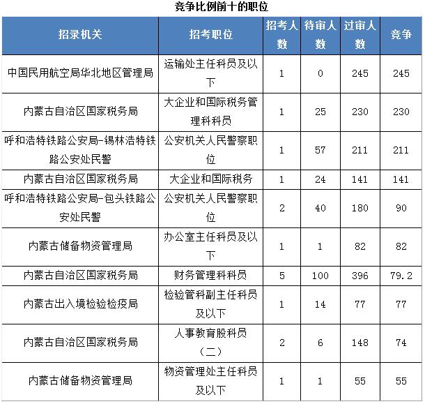 通過審核人數最多的前十個職位中內蒙自治區國家稅務局占了9席,其中稽查局科員(二)、 通過審核人數為872人,管理股科員(二)審核人數為817人,競爭比例分別為18.96:1與11.35:1.具體信息如下: