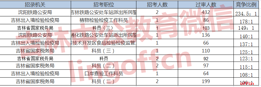 報名通過審核人數前十的職位主要集中在沈陽鐵路公安局、吉林國家稅務局、吉林出入境檢疫檢驗局等部門,具體信息如下: