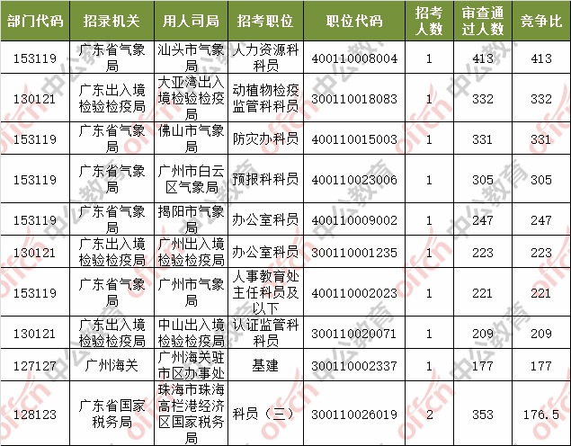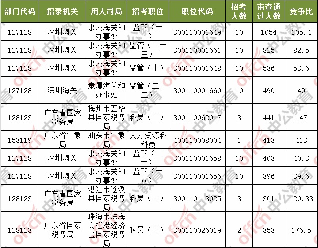 報名通過審核人數前十的職位主要集中在深圳海關、廣東省國家稅務局、廣東省氣象局等部門,具體信息如下:
