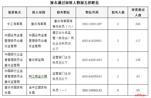 報名通過審核人數前五的職位主要集中在中國銀行業監督管理委員會重慶監管局、長江海事局、重慶市國家稅務局等部門,具體信息如下: