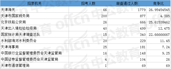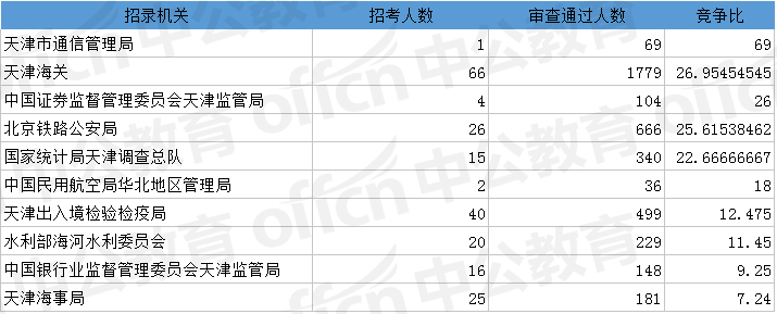 為幫助廣大考生更清晰的了解今日報名情況,中公網校整理了審核通過人數前十位的部門以及競爭比例最激烈的十大部門,供廣大考生參考: