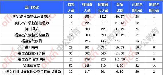 截至11月3日16時,據(jù)中公網(wǎng)校統(tǒng)計,國考職位中工作地點在福建的職位2527人待審,5824人通過審核,共報名6607人,其中有21個職位無人報名,平均競爭比例為22.31:1。