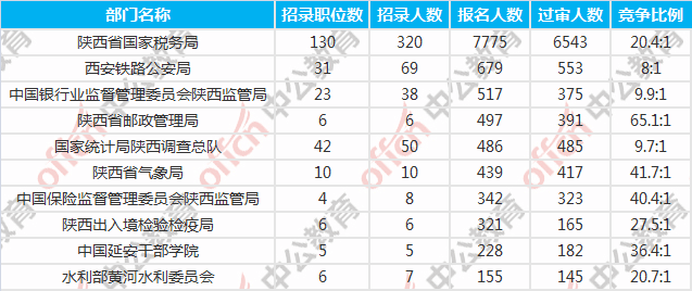 為幫助廣大考生更清晰的了解今日報名情況,陜西中公網校整理了報名人數前十位的部門以及競爭比例最激烈的十大部門,供廣大考生參考: