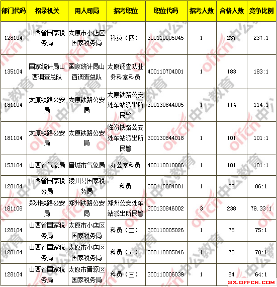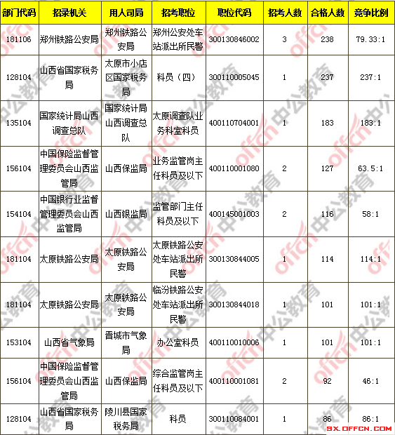 報名通過審核人數前十的職位主要集中在鄭州鐵路公安局、山西省國家稅務局、國家統計局山西調查總隊等部門,具體信息如下: