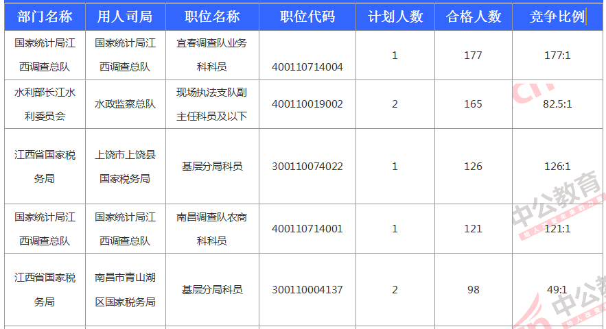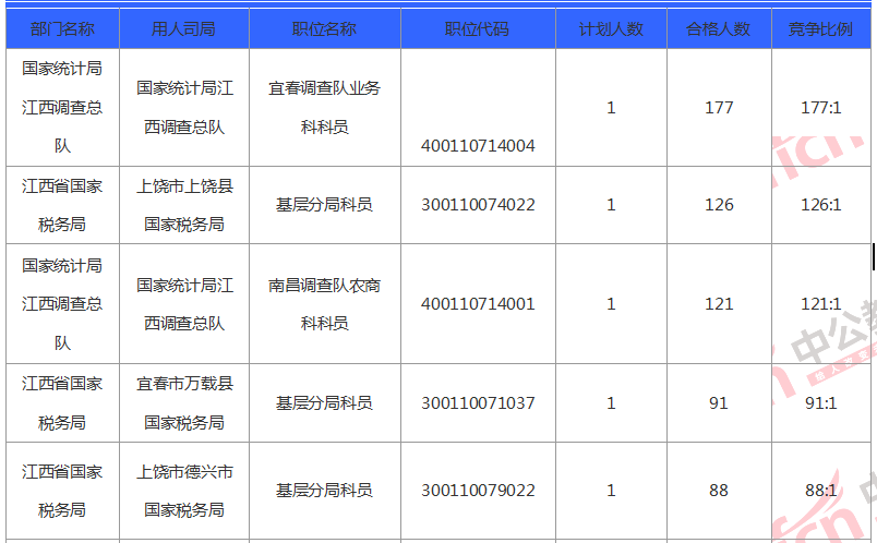 截止到3日16時,競爭比例的職位為國家統計局江西調查總隊國家統計局江西調查總隊宜春調查隊業務科科員一職,招錄1人,截止到3日16時通過人數為177人,位列第二的江西省國家稅務局上饒市上饒縣國家稅務局基層分局科員僅126:1