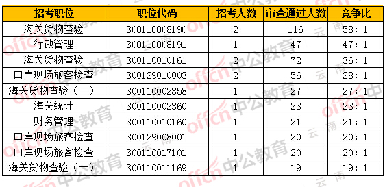 2018國家公務員海關報名人數截止11月3日:河口海關海關貨物查驗,職位代碼:300110008190,招錄2人,審查通過人數為116人,暫時競爭比為58:1,具體信息如下: