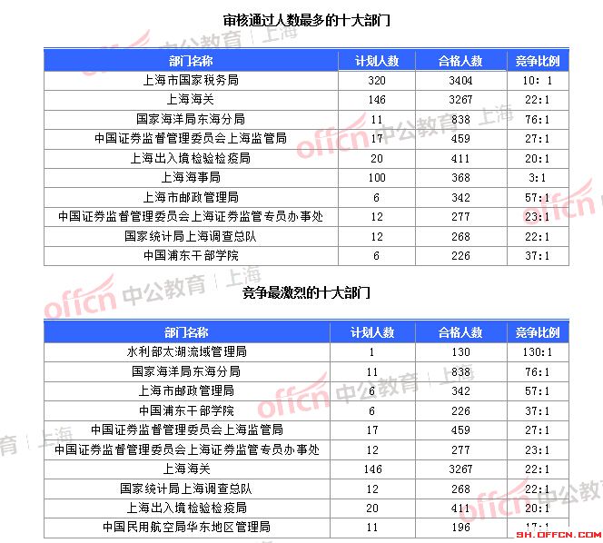 為幫助廣大考生更清晰的了解今日報名情況,中公網校整理了審核通過人數前十位的部門以及競爭比例最激烈的十大部門,供廣大考生參考: