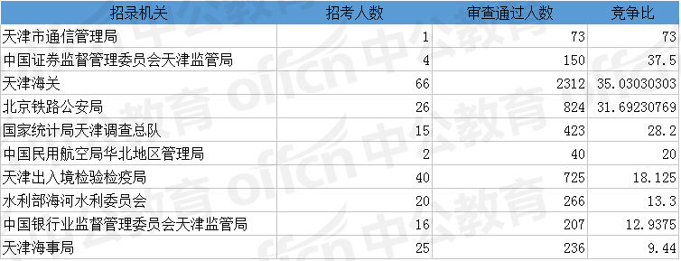 為幫助廣大考生更清晰的了解今日報名情況,中公網校整理了審核通過人數前十位的部門以及競爭比例最激烈的十大部門,供廣大考生參考: