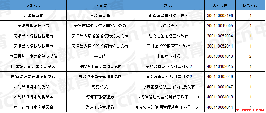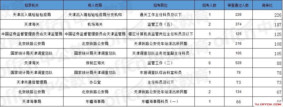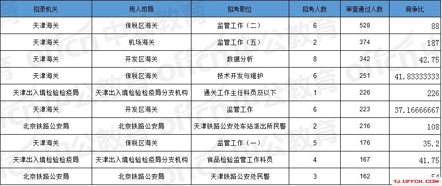 報名通過審核人數前十的職位主要集中在天津海關、北京鐵路公安局、天津出入境檢驗檢疫局等部門,具體信息如下: