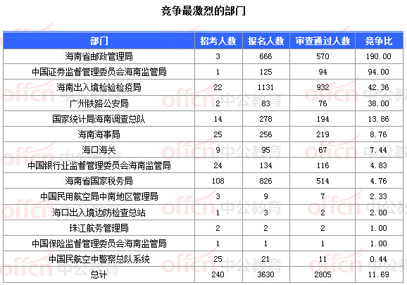 截止到4日16時,通過審核人數(shù)前三位的部門依次是:海南出入境檢驗檢疫局、海南省郵政管理局、海南省國家稅務局,三部門通過審核總人數(shù)達2016人,占通過審核總人數(shù)的71.87%。