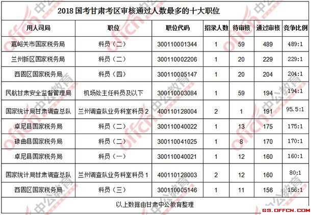 報名通過審核人數(shù)前十的職位主要集中在嘉峪關市國家稅務局、蘭州新區(qū)國家稅務局、西固區(qū)國家稅務局等部門,具體信息如下: