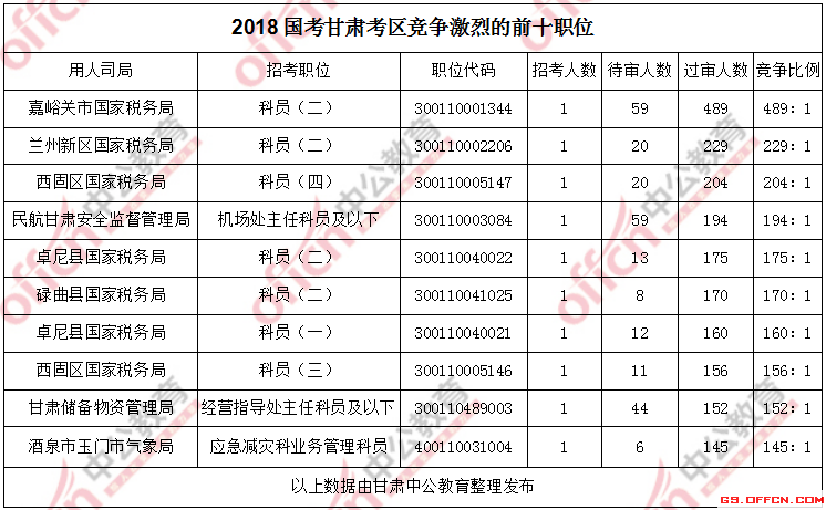 11月4日16時,競爭比例的職位為甘肅省國家稅務局嘉峪關市國家稅務局科員(二)一職,招錄1人,11月4日16時通過人數(shù)為489人,競爭比例為489:1!