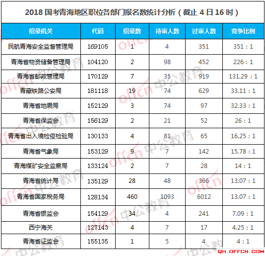 以下是4日16時各部門報名人數統計分析,其中中國民航青海安全監督管理局、青海省物資儲備管理局、青海省郵政管理局等三個部門競爭最激烈,競爭比均已超過131:1。