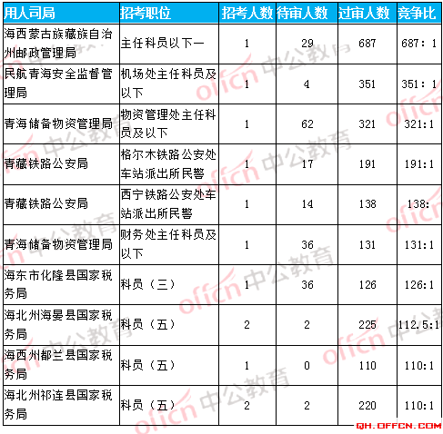 截至到4日16時,競爭比例的職位為海西蒙古族藏族自治州郵政管理局主任科員以下一職,招錄1人,截至到4日16時審核通過人數為687人,是此次國考青海地區競爭比例的一個職位!