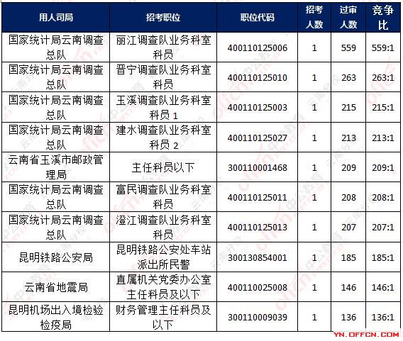 當前最受歡迎的崗位是國家統計局云南調查總隊,麗江調查隊業務科室科員,職位代碼:400110125006,招錄1人,560人報名,其中1人待審核通過,詳情如下圖: