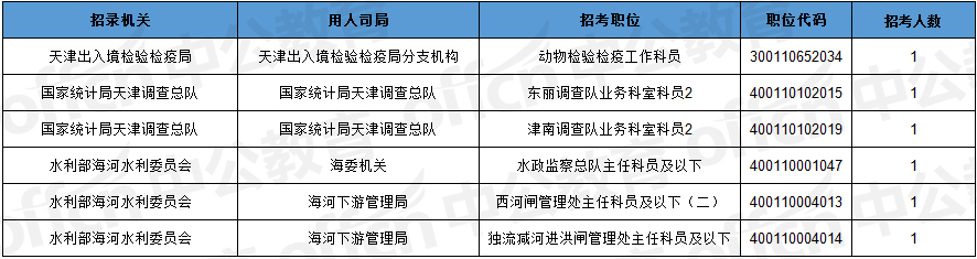 截止到5日09時,工作地點在天津的職位共有6個無人報考,占全部職位的2.8%。下圖是無人報考職位一覽表,中公網校建議廣大考生多關注一些較冷職位,避免激烈競爭,結合自身條件,找到屬于自己的職位。