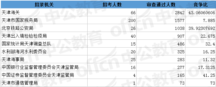 為幫助廣大考生更清晰的了解今日報名情況,中公網校整理了審核通過人數前十位的部門以及競爭比例最激烈的十大部門,供廣大考生參考: