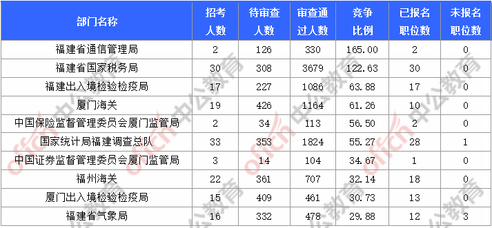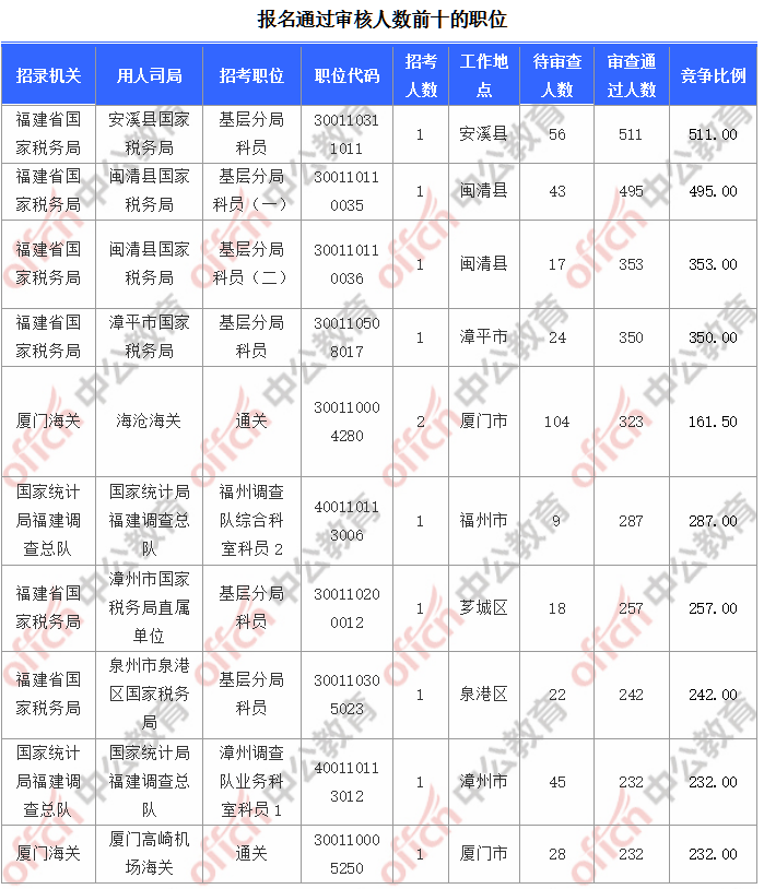 報名通過審核人數前十的職位主要集中在福建省國家稅務局、廈門海關、國家統計局福建調查總隊等部門,具體信息如下: