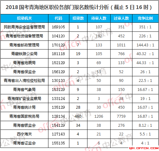 截至11月5日16時,據中公網校統計,國考職位中工作地點在青海省的職位報名人數為13605人,通過審核總人數為11554人,平均競爭比例為31.83:1。