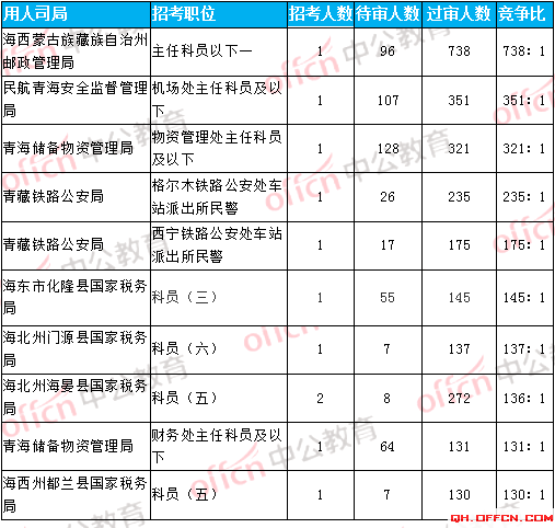 以下是4日16時各部門報名人數統計分析,其中中國民航青海安全監督管理局、青海省物資儲備管理局、青海省郵政管理局等三個部門競爭最激烈,競爭比均已超過144:1。