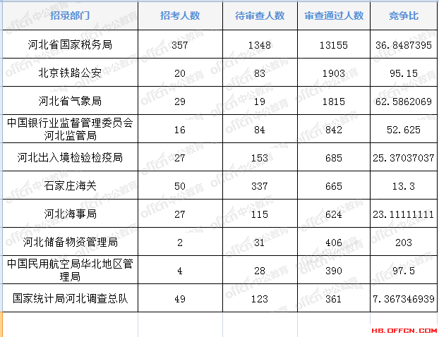 報名通過審核人數前十的職位主要集中在河北省氣象局、北京鐵路公安局、中國民用航空局華北地區管理局等部門,具體信息如下: