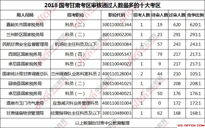 報名通過審核人數前十的職位主要集中在嘉峪關市國家稅務局、蘭州新區國家稅務局、西固區國家稅務局等部門,具體信息如下: