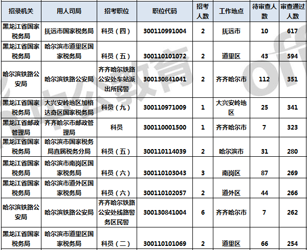 報名通過審核人數前十的職位主要集中在黑龍江省國家稅務局、哈爾濱鐵路公安局、黑龍江省郵政管理局等部門,具體信息如下:
