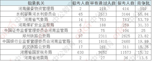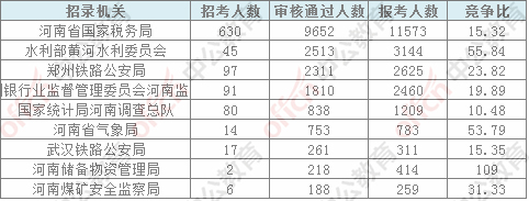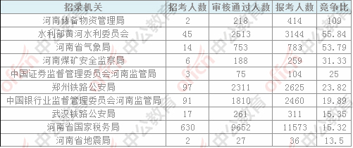 報名通過審核人數前十的職位主要集中在鄭州鐵路公安局、河南省氣象局、河南省國家稅務局,具體信息如下: