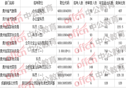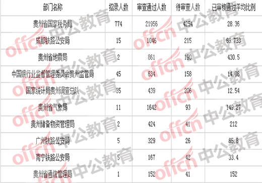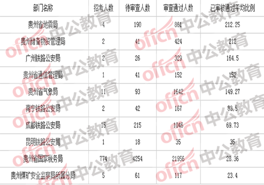 截止到5日16時(shí),通過審核人數(shù)前三位的部門依次是:貴州省國(guó)家稅務(wù)局、北貴州省氣象局、成都鐵路公安局,三部門通過審核總?cè)藬?shù)達(dá)24644人,占通過審核總?cè)藬?shù)的90%。