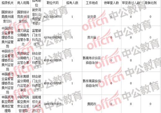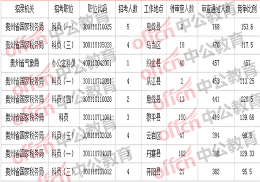 截至11月5日16時(shí),據(jù)中公網(wǎng)校統(tǒng)計(jì),國(guó)考職位中工作地點(diǎn)在貴州的職位通過審核總?cè)藬?shù)為27901人,共有8個(gè)職位無(wú)人通過審核,平均競(jìng)爭(zhēng)比例為33:1。