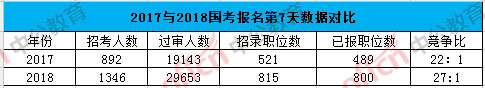 截至11月5日16時(shí),據(jù)中公網(wǎng)校統(tǒng)計(jì),2018國(guó)家公務(wù)員考試報(bào)名第7天,招錄職位中工作地點(diǎn)在湖北的職位報(bào)名總?cè)藬?shù)為41198人,通過(guò)審核29653人,比去年同期審核通過(guò)人數(shù)(19143人)增加10510人,815個(gè)職位中共有15個(gè)職位無(wú)人報(bào)考,平均競(jìng)爭(zhēng)比例為27:1。具體信息如下: