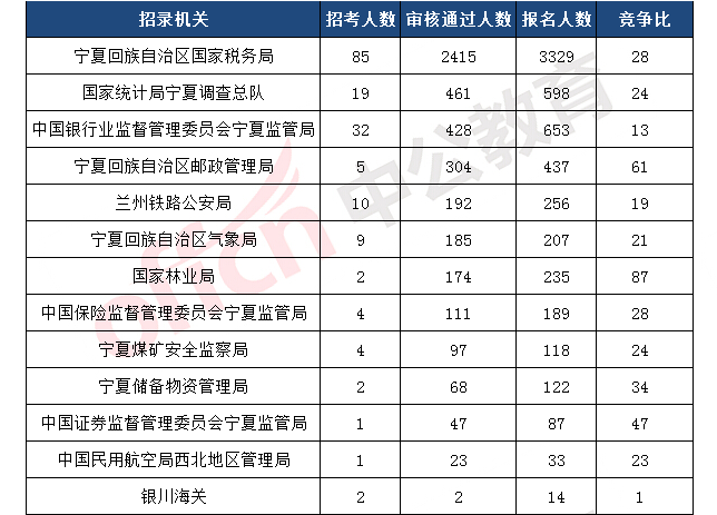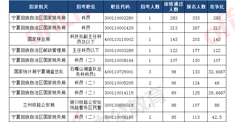 截止到11月6日9時(shí),報(bào)名通過(guò)審核人數(shù)前十的職位主要為寧夏回族自治區(qū)國(guó)家稅務(wù)局、國(guó)家林業(yè)局,具體信息如下: