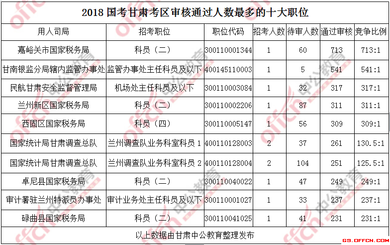 報名通過審核人數(shù)前十的職位主要集中在嘉峪關(guān)市國家稅務局、甘南銀監(jiān)分局轄內(nèi)監(jiān)管辦事處、民航甘肅安全監(jiān)督管理局部門,具體信息如下: