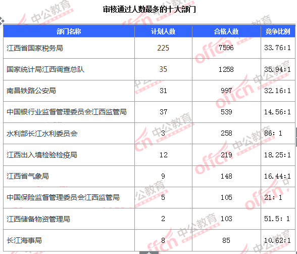 截止到6日16時,通過審核人數前三位的部門依次是:江西省國家稅務局、國家統計局江西調查總隊、南昌鐵路公安局,三部門通過審核總人數達10851人,占通過審核總人數的94.3%。