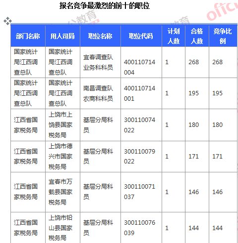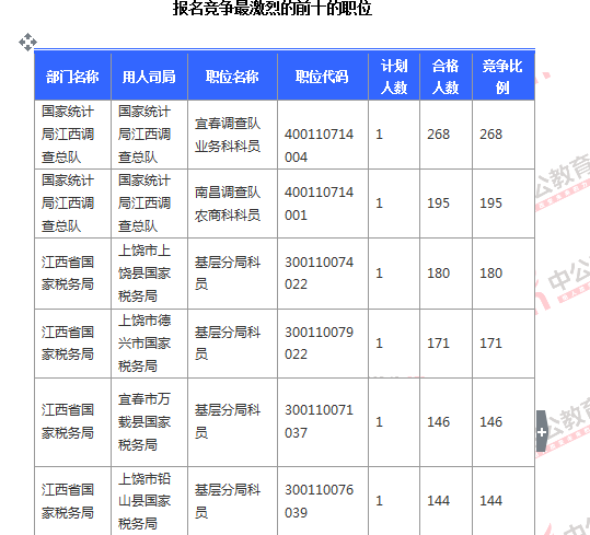截止到6日16時,競爭比例的職位為國家統計局江西調查總隊國家統計局江西調查總隊宜春調查隊業務科科員一職,招錄1人,截止到6日16時通過人數為268人,位列第二的國家統計局江西調查總隊國家統計局江西調查總隊南昌調查隊農商科科員一職,為195:1