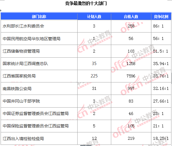 為幫助廣大考生更清晰的了解今日報名情況,中公教育整理了審核通過人數前十位的部門以及競爭比例最激烈的十大部門,供廣大考生參考: