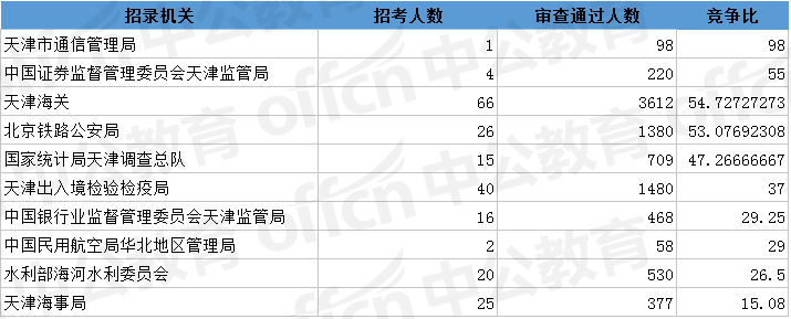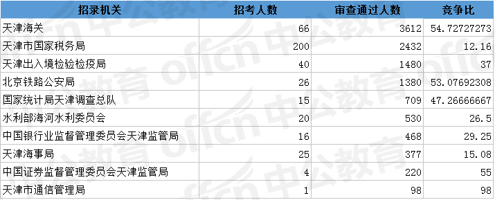 為幫助廣大考生更清晰的了解今日?qǐng)?bào)名情況,中公網(wǎng)校整理了審核通過人數(shù)前十位的部門以及競(jìng)爭(zhēng)比例最激烈的十大部門,供廣大考生參考: