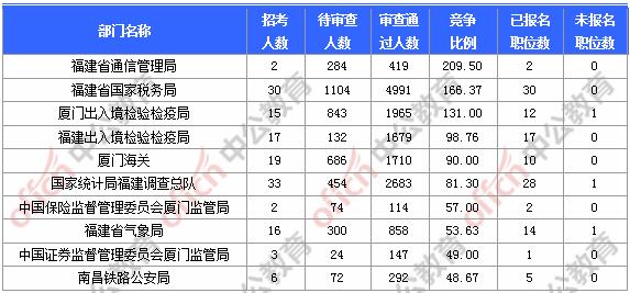 報名通過審核人數前十的職位主要集中在福建省國家稅務局、廈門出入境檢驗檢疫局、廈門海關,具體信息如下: