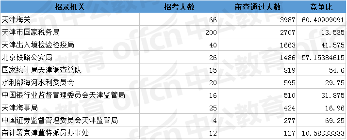 為幫助廣大考生更清晰的了解今日報名情況,中公網校整理了審核通過人數前十位的部門以及競爭比例最激烈的十大部門,供廣大考生參考: