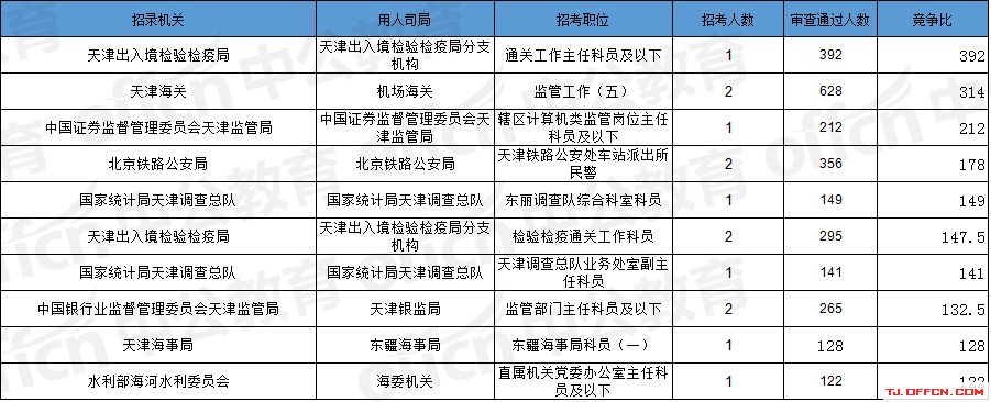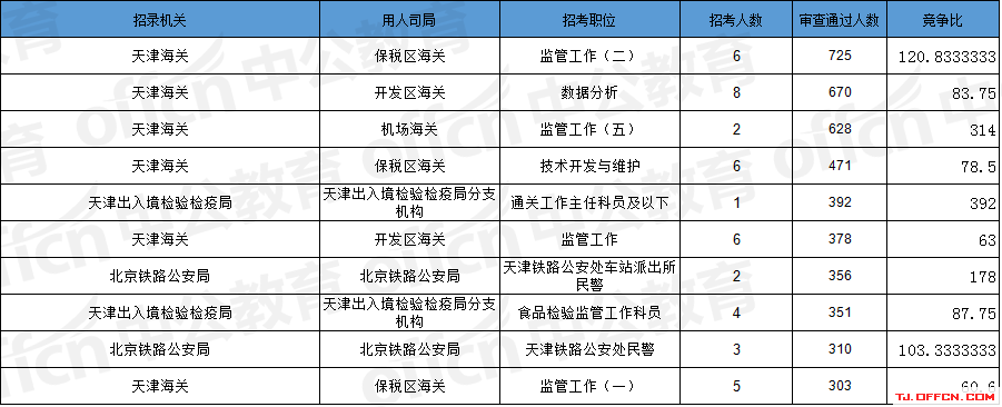 報名通過審核人數前十的職位主要集中在天津海關、北京鐵路公安局、天津出入境檢驗檢疫局等部門,具體信息如下: