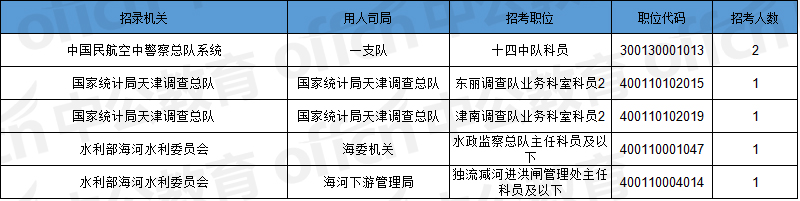 截止到7日16時,工作地點在天津的職位共有5個無人報考,占全部職位的2.4%。下圖是無人報考職位一覽表,中公網校專家建議廣大考生多關注一些較冷職位,避免激烈競爭,結合自身條件,找到屬于自己的職位。
