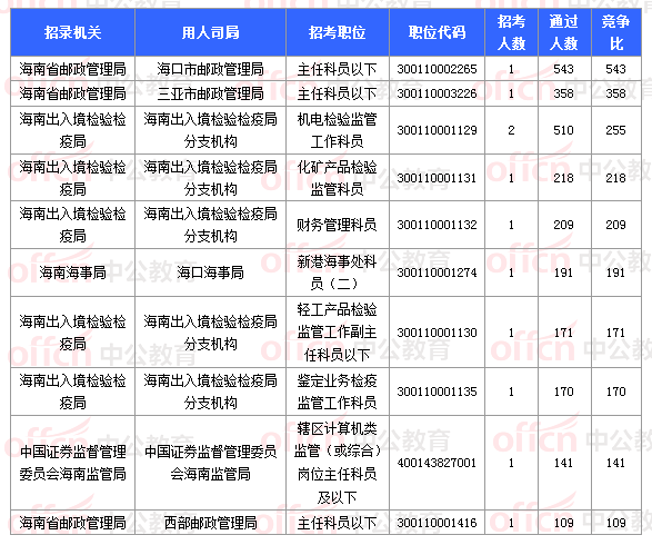 報名通過審核人數前十的職位主要集中在海南省郵政管理局、海南出入境檢驗檢疫局、海南海事局等部門,具體信息如下: