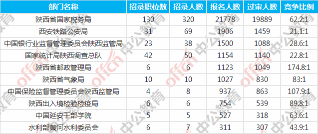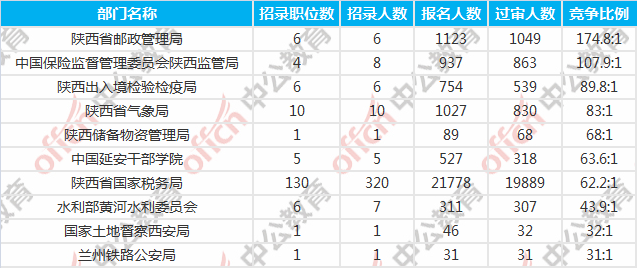報名人數(shù)前十的職位主要集中在陜西省國家稅務(wù)局、中國保險監(jiān)督管理委員會陜西監(jiān)管局、陜西省氣象局等部門,具體信息如下: