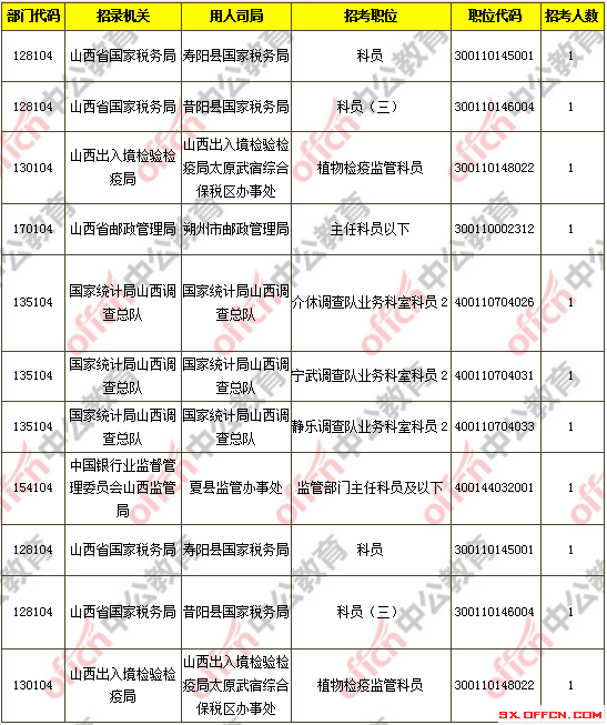 截止到11月7日16時,工作地點在山西的職位共有8個無人報考,占全部職位的0.04%。下面是無人報考職位一覽表,中公網校專家建議廣大考生多關注一些較冷職位,避免激烈競爭,結合自身條件,找到屬于自己的職位。