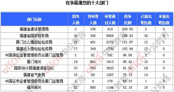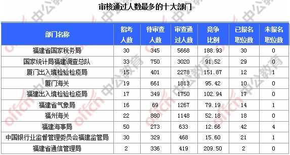 截止到7日16時,通過審核人數前三位的部門依次是:福建省國家稅務局、國家統計局福建調查總隊、廈門出入境檢驗檢疫局,三部門通過審核總人數達10966人,占通過審核總人數的56.54%。