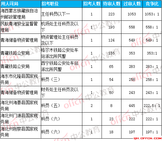 以下是7日16時各部門報名人數統計分析,其中中國民航青海安全監督管理局、青海省物資儲備管理局、青海省郵政管理局等三個部門競爭最激烈,競爭比均已超過219:1。