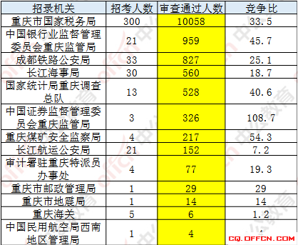 為幫助廣大考生更清晰的了解今日報名情況,中公網(wǎng)校整理了重慶市招錄機關(guān)的招錄情況,供廣大考生參考: